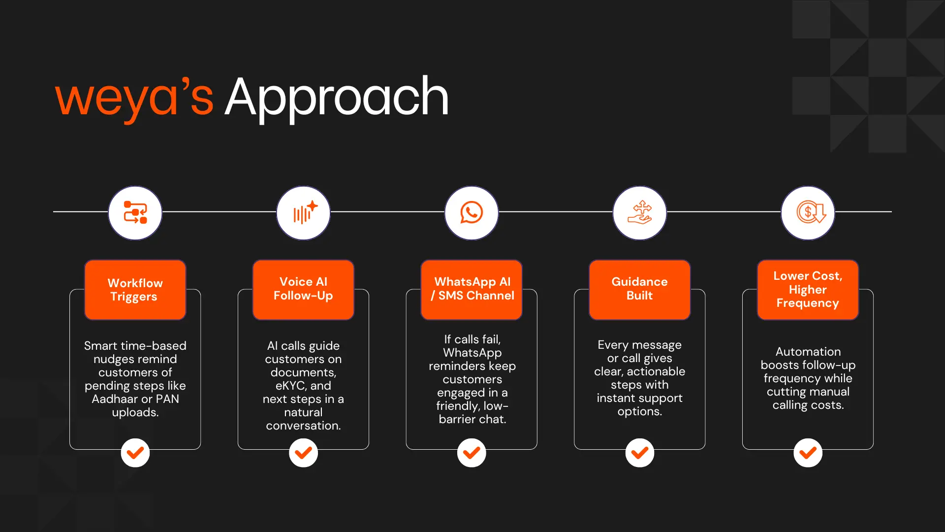Weya AI came in to help transform that process using automated workflows, timed nudges, and multi-channel conversational outreach to guide customers through every sticking point. The outcome: a measurable improvement in loan sanction conversion, lower cost per conversion, and a smoother customer experience.